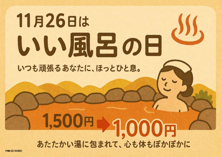 いい風呂の日 入浴料¥1,000に! 2025.11.23 天神の湯 イベント 今週の11/26(木)は、いい風呂の日!1年に1回の特別な日です。入浴料¥1,500が¥1,000に!ご利用お待ちしております。 【11月14日岩盤浴空調設備の工事に伴うお詫びとご案内】