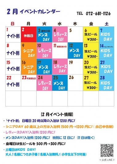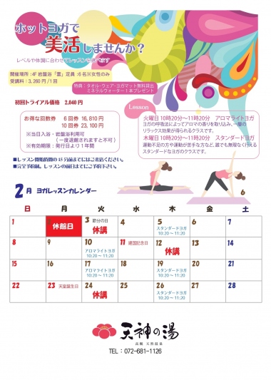 天神の湯 2月度のイベントカレンダーとヨガカレンダーです。