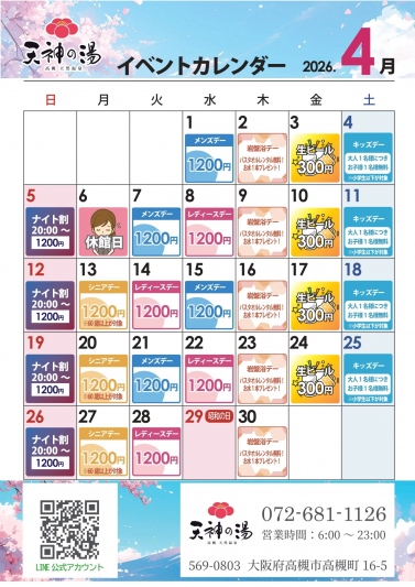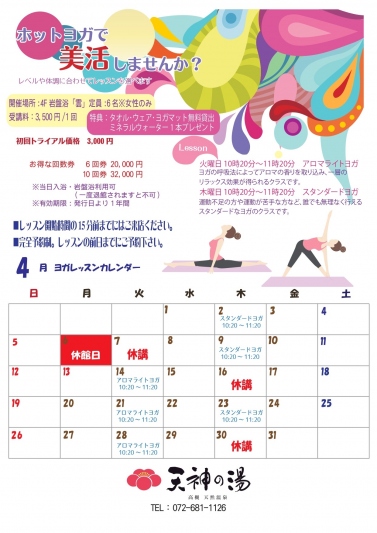天神の湯 4月度のイベントカレンダーとヨガカレンダーです。