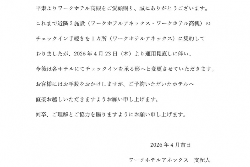 平素よりワークホテル高槻をご愛顧賜り、誠にありがとうございます。