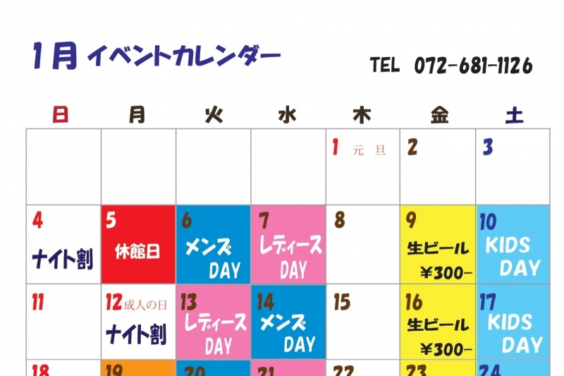 天神の湯 1月度のイベントカレンダーとヨガカレンダーです。