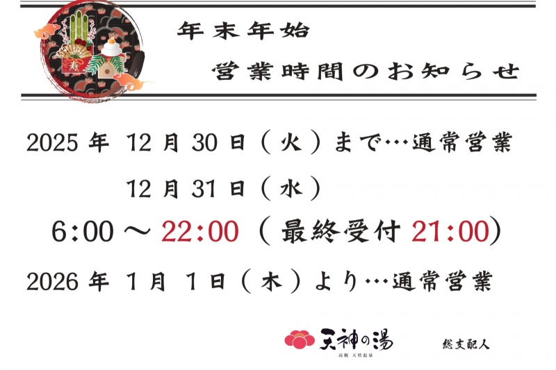 12月31日(水)のみ 6:00~22:00(最終受付21:00)