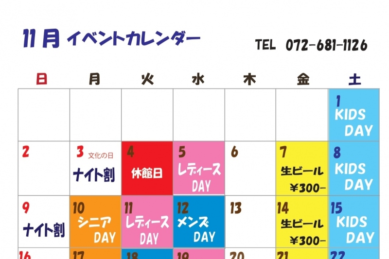 天神の湯 11月度のイベントカレンダーとヨガカレンダーです。